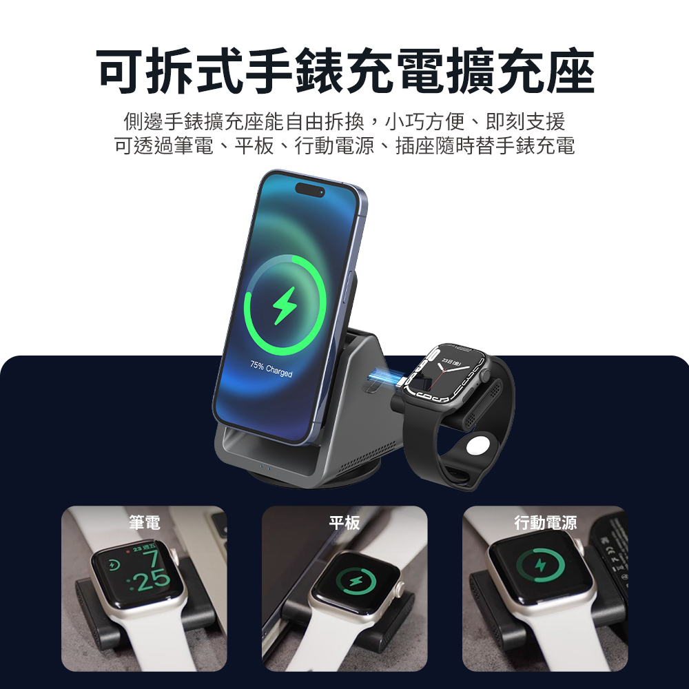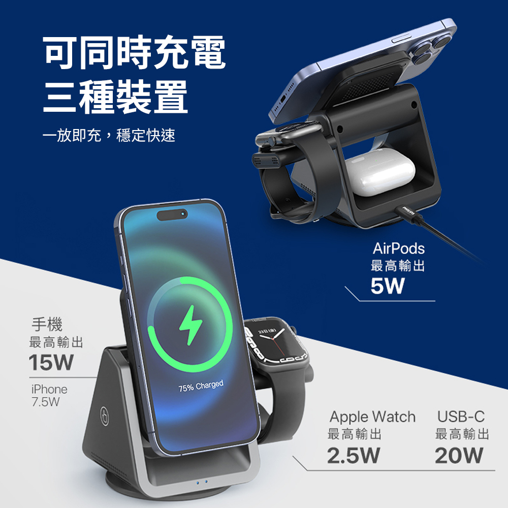 ● 智慧型功率輸出,手機、耳機、AppleWatch可同時充電