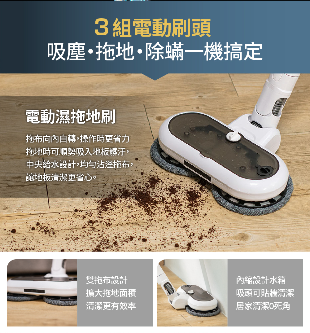 ●電動濕拖地刷拖布向內自轉操作時更省力