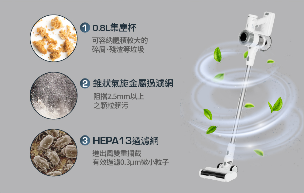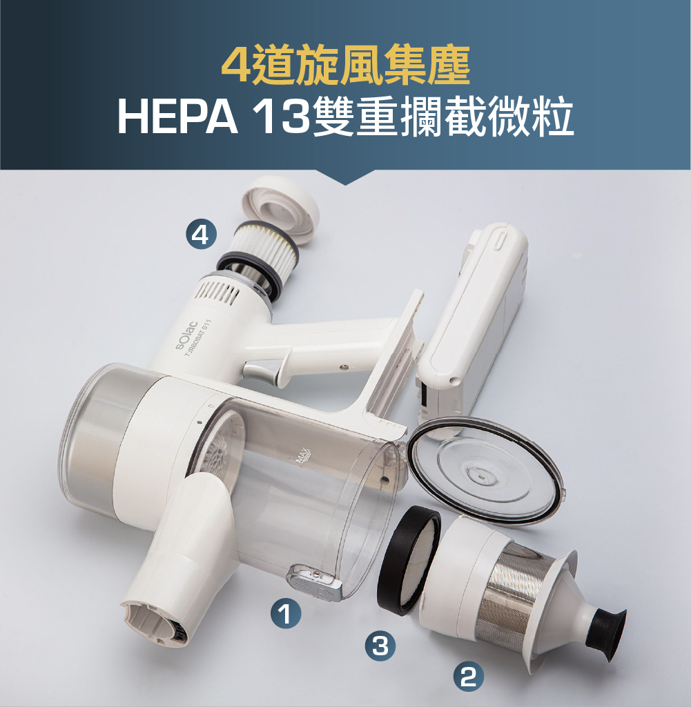 ●四道旋風集塵HEPA 13雙重攔截微粒
