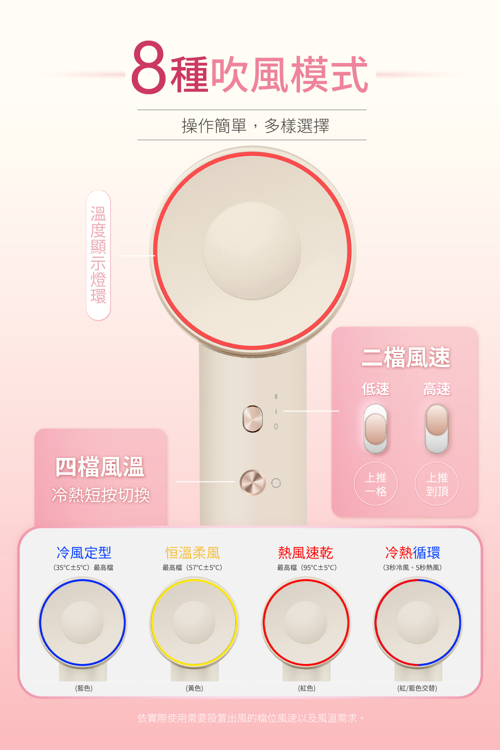● 溫度顯示燈環8種吹風模式
